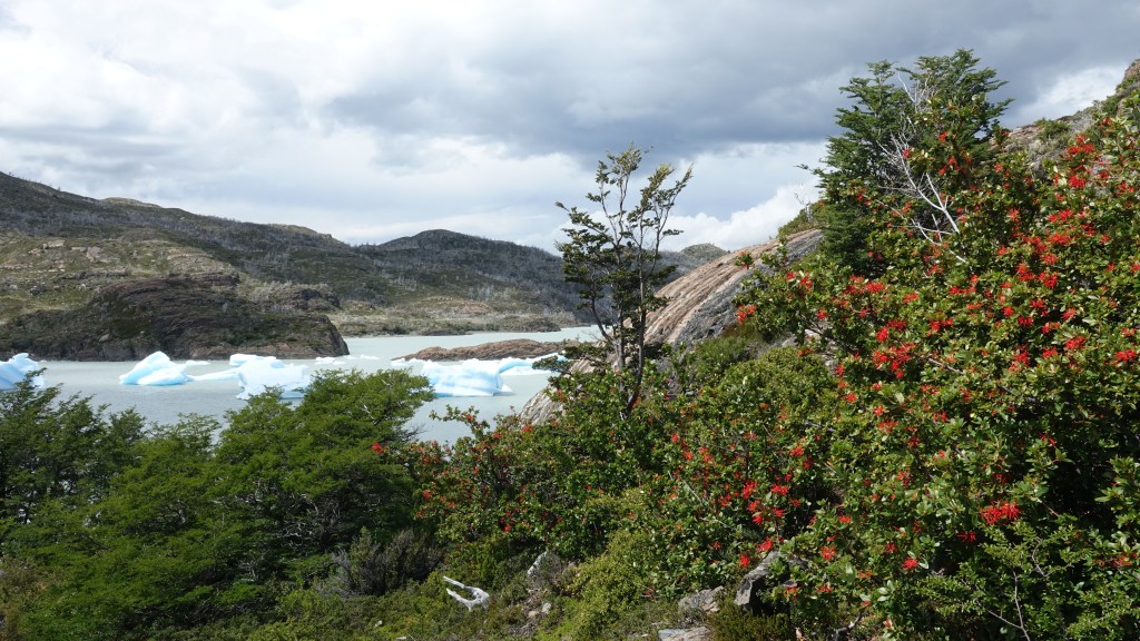 26. – 28.11.2019: Der Nationalpark im Süden Chiles bietet allein schon Möglichkeiten für Wochen. Berge, Wälder, Seen, Gletscher und das alles in wirklich einzigartigem Arrangement. Die Fahrt in den Nationalpark erinnert landschaftlich an Westkanada. Speziell die roten Büsche machen aber einen schönen Unterschied. Nach dem Einchecken in den Nationalpark erreichen wir bald den Lago Grey, der eigentlich die Lagune des gleichnamigen Gletschers ist.