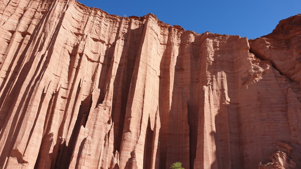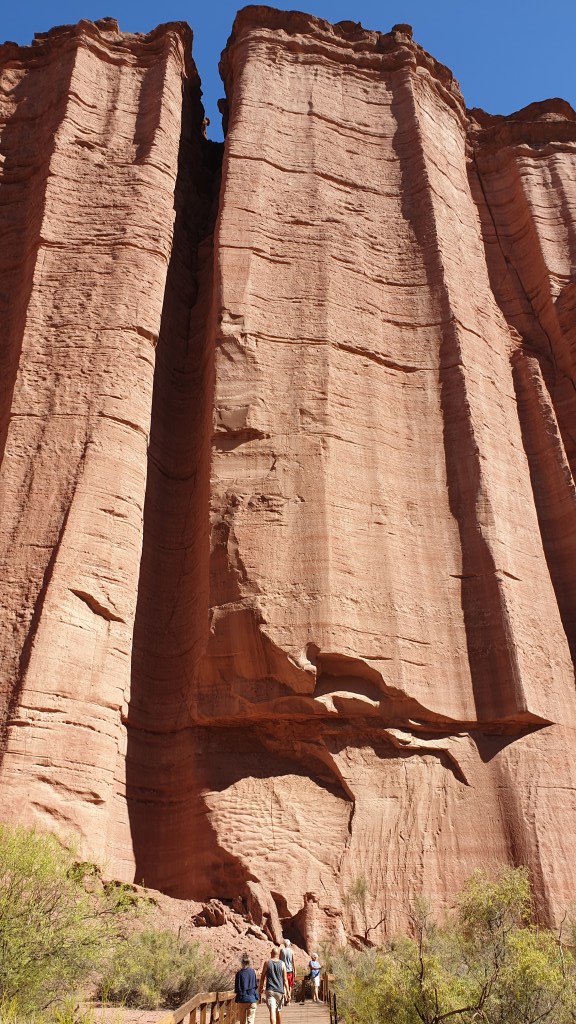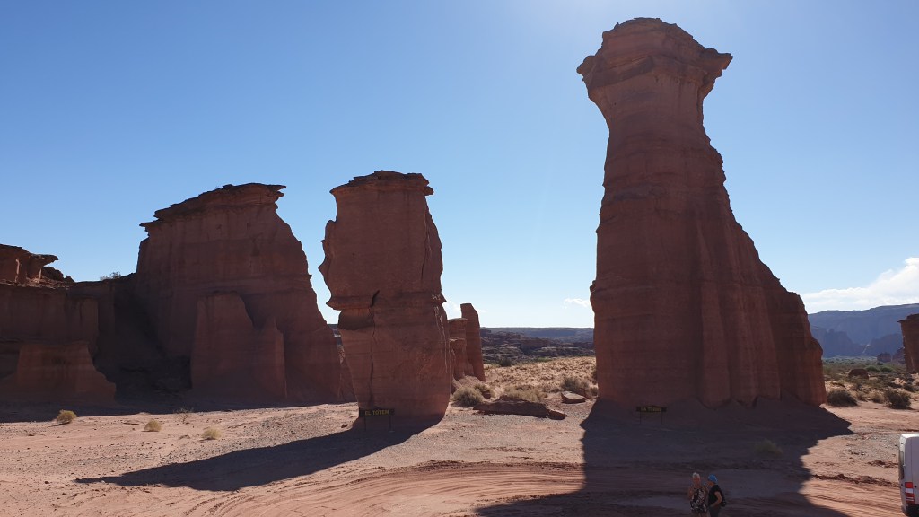Am Mittag führt uns die Fahrt weiter zum nächsten Nationalpark. Talampaya heisst er, ist knappe 80 Kilometer entfernt, und befindet sich grob gesagt oben auf dem roten Gesteinsmassiv, welches das Valle de La Luna nach Osten abgrenzt.