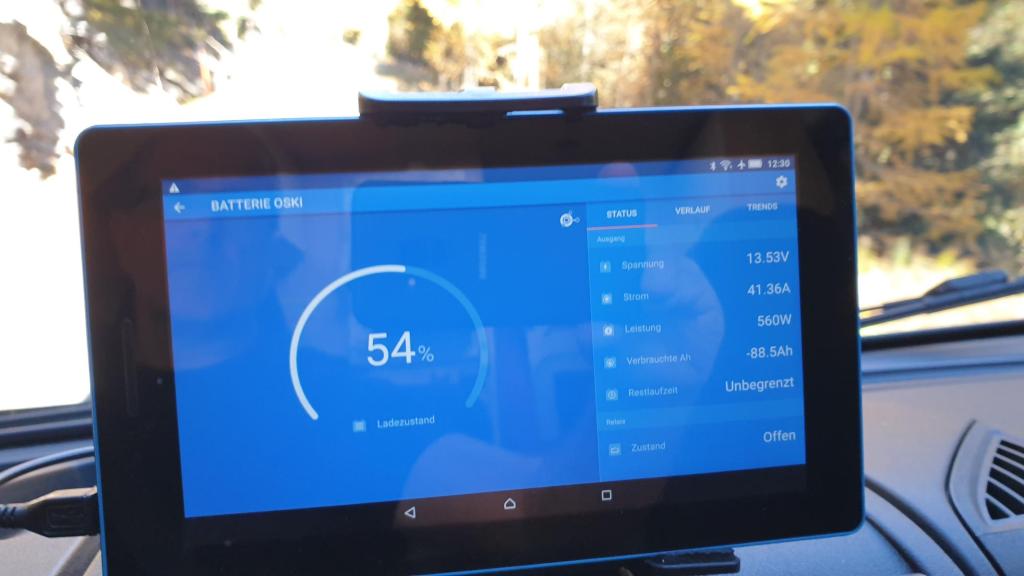 Die Spannung ist bei hohen Strömen, wie sie beim Gebrauch eines Wechselrichters entstehen können, deutlich stabiler. In der Praxis kommt unser Fahrzeug auf Reisen komplett ohne Landstrom aus. Die elektrische Autarkie bewegt sich im Winter bei ca. 4 Tagen und ist im Sommerhalbjahr mit dem Solarertrag erfahrungsgemäss nahezu unbegrenzt. Eine mobile Solartasche von Wattstunde ergänzt die Leistung der Dachpanels. Diese wurde später ersetzt durch eine Tasche von Shawllar.