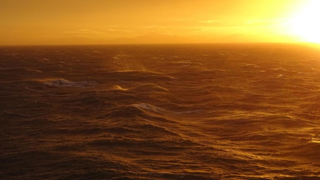 Cook Strait bei Sonnenuntergang: Die Meerenge zwischen Süd- und Nordinsel ist berüchtigt. Selbst bei Stellung „Moderate“ auf der Anzeige der zu erwartenden Wellenhöhe schaukelt die Interislander-Fähre ordentlich und der Wind pfeift einem an Deck um die Ohren. Das Foto bei Sonnenuntergang mag einen Eindruck geben, zeigt das Erlebte aber nur in Ansätzen.