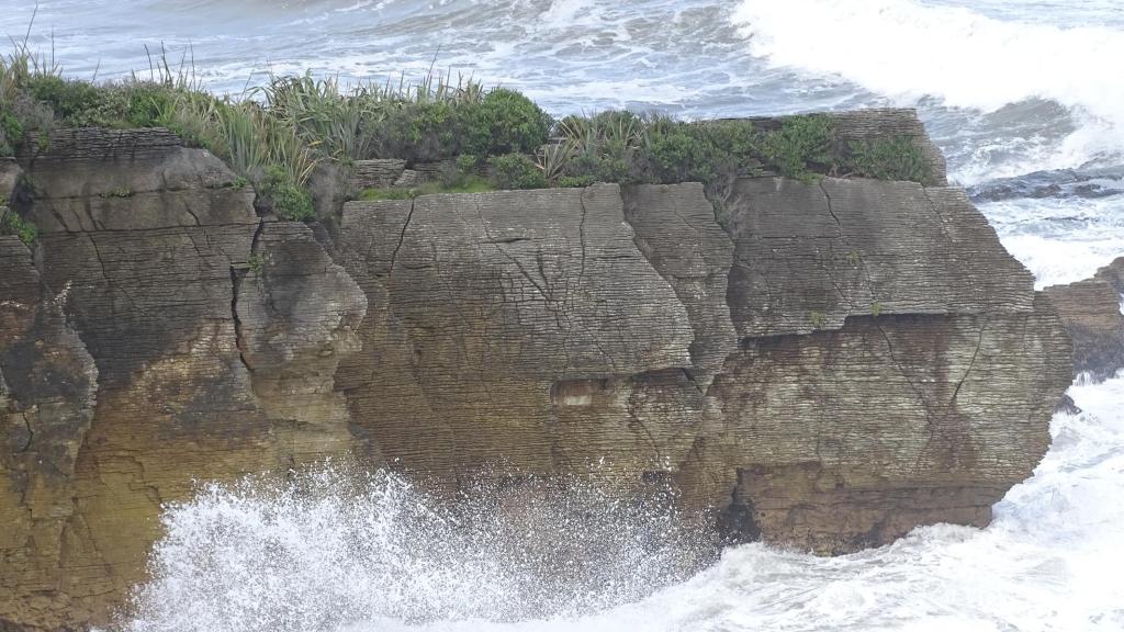 Pancake Rocks: Die Pfannkuchenfelsen an der Westküste der Südinsel sind ein Touristenmagnet und doch frei zugänglich. Ein Rundweg erschliesst diese eindrucksvollen Formationen. Die Dünung der Tasmansee gibt den Rhythmus und es macht wirklich Spass, den heranrollenden krachenden Wellen in den Buchten und Gräben zuzusehen.